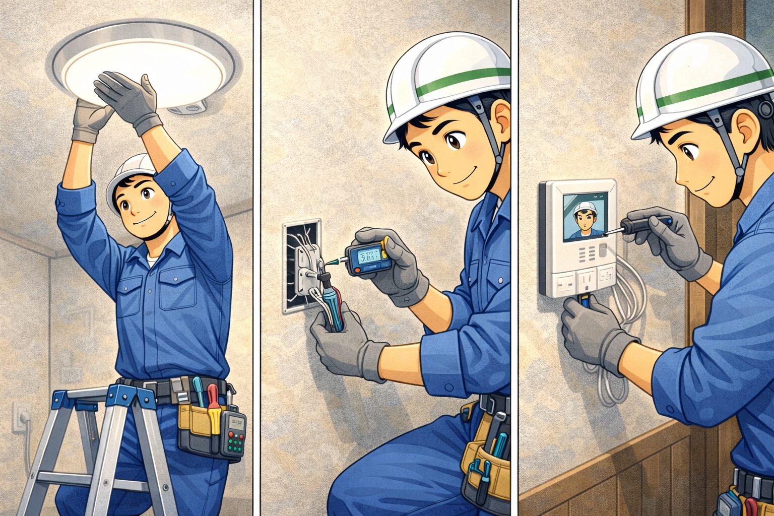 家電量販店の業務委託として行う電気工事の中でも、照明・コンセント・インターフォンは案件数が多く、未経験〜経験者まで幅広く担当する工事です。