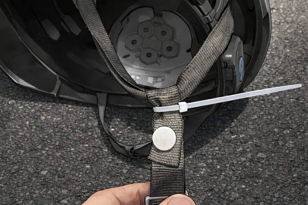 左右の「耳ひも」と「顎ひも」を、ずり下がらない位置でインシュロックで縛る